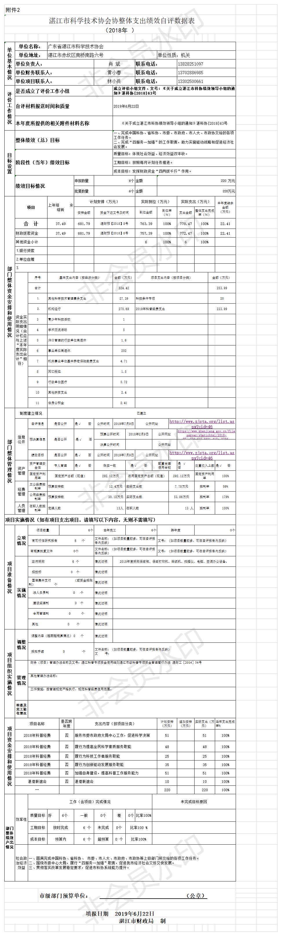 湛江市科学技术协会协整体支出绩效自评数据表