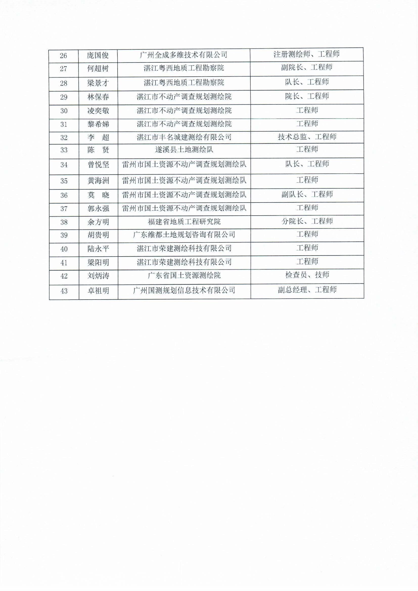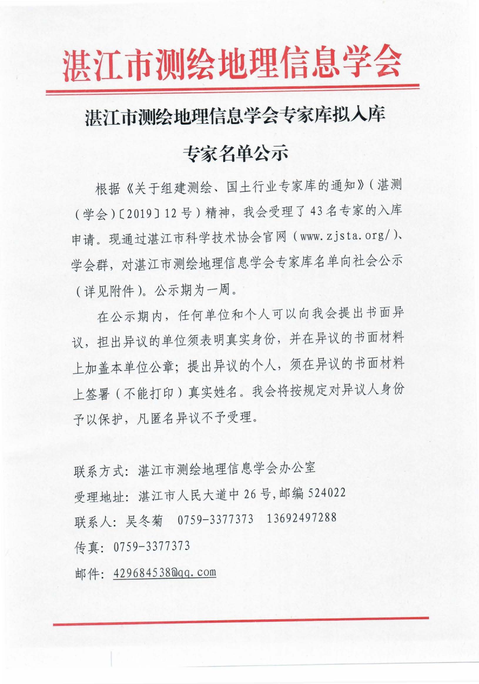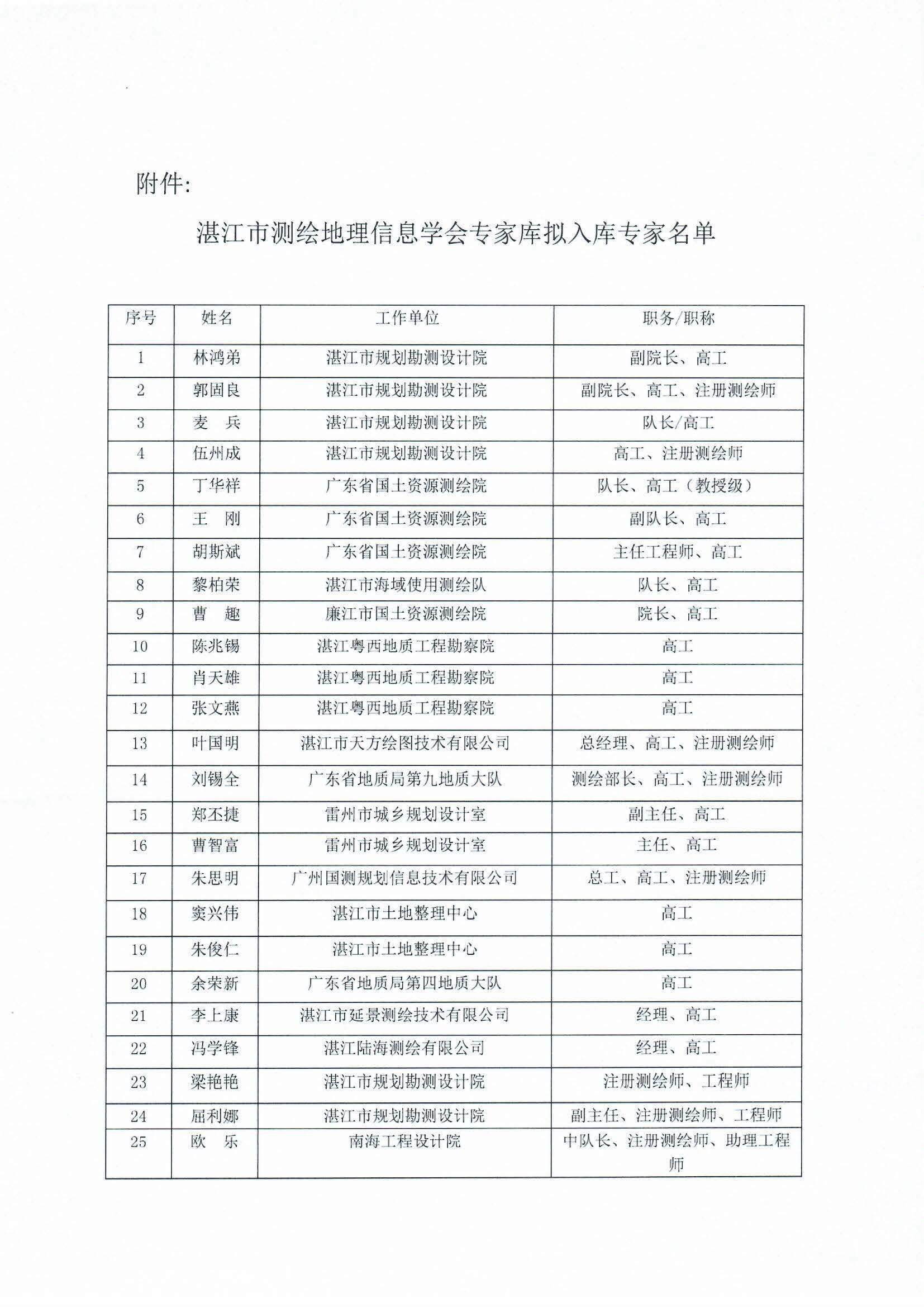 湛江市测绘地理信息学会专家库存拟入库专家名单公示