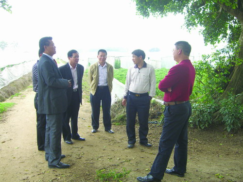 (湛江市科协主席黄东云(左二)、副主席郭向明在廉江市政府办公室副主任廖忠武和廉江市科协主席吴凌等有关领导的陪同下一起到湛绿基地调研)