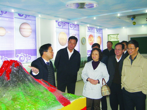 检查组考察廉江市一中科普教育展厅,黄梅玉(中)、黄东云(右二)、罗岗(左二),该校张旭校长(左一)介绍学校科普设施