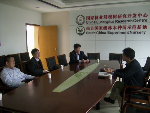 南方国家级林木种苗示范基地党组书记谢耀坚向市科协领导介绍了桉树的发展情况,回答了市科协领导提出的关于桉树与气候、水土、生态、桉树虫害防治等有关问题。