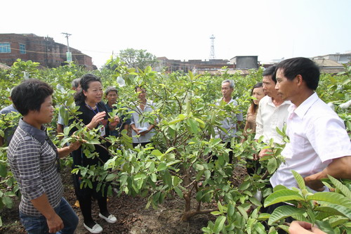 (技术讲解员孙晓雯女士走到良垌镇琴山管理区一蕃石榴种植基地,向当地农民传授“四送一训”科普惠农知识)