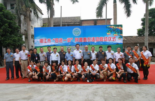 启动仪式上,湛江市科协主席黄东云指出,科技在农业生产中发挥着重要的作用,我们有义务积极探索,建立科普工作社会化新格局,把农业新科技、新成果送到农民手中,推广到千家万户,提高广大农民群众科学素养,促进农业增效和农民增收。市科协经研究决定,引进“科普惠农讲师团”强大师资队伍,在全市范围内开展以“送资料、送科技、送新项目、送新成果,开展农村实用技术培训”为内容的“四送一训”科普惠农活动,“四送一训”活动,是一项惠及广大农民群众的实事好事。我们必须以更加务实的作风,更加扎实的工作,更加有效的形式将这一实事做实、好事办好。进一步增强广大农民群众学科技、用科技、依靠科技发展生产的自觉性和主动性,促进农业科技的推广应用和成果转化。希望各相关部门要认真组织农户、涉农部门干部和科技人员参与活动,掌握新科技、新知识,了解新成果、新动态,把湛江市科技培训、普及工作推上一个新台阶。
