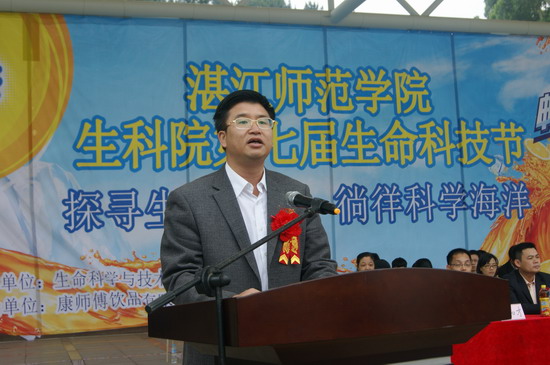 2013年4月14日上午,“探索生命奥秘,徜徉科学海洋”湛江师范学院生命科学与技术学院第七届生命科技节在雷阳广场隆重开幕。湛江市科学技术协会肖斌主席出席并致辞.。他代表湛江市科学技术协会对生科院成功举办第七届生命科技节表示祝贺,他说,随着湛江多项一体化,大交通、工程等一大批项目的实施,可预见湛江经济快速发展的同时一定要面临对人才和技术知识的大需求,因此也期望同学们在争取不断的提高自己的科学素质的同时,给予社会需求高度的关注和积极的参与。促进经济发展提供优质的服务,并加强与学校的联系,共同进步和发展。