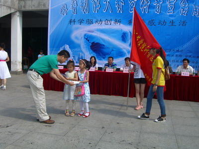 市科协黄振洪主任为青年志愿者和幼儿园小朋友赠送科普知识小册子