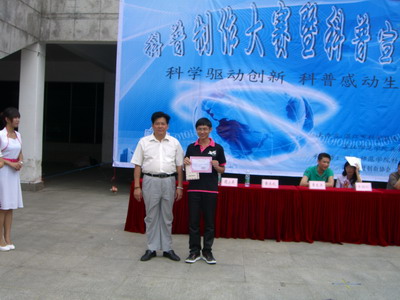 经过了激烈的角逐和活跃的现场互动问答后,5号选手群雄角逐,赢得了评委们青睐的目光,获得了本次大赛的一等奖以及。市科协黄承礼部长在为最具创新奖获得者颁奖。