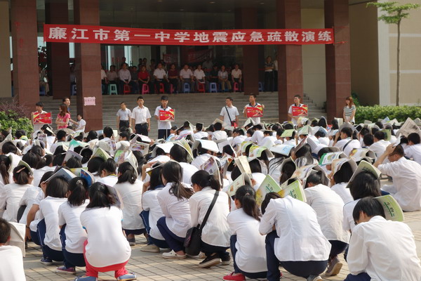 5月13日,在廉江市第一中学举行地震应急疏散演练。廉江市政府副市长崔军、湛江市科协副主席郭向明、湛江市地震局局长冯土兴等领导到场指导演练,城区中小学校长观摩了演练的全过程。(上图)