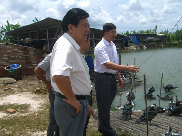 随后,在吴川市科协主席梁河清等领导的陪同下,马不停蹄地赶到科普惠农田间地头进行调研,考察了吴川科普示范基地养殖场,与科普养殖示范户进行了交流,听取他们采取鸭-猪-鱼-香蕉立体种养的科学养殖方法和取得实效经验介绍。肖斌一行边听边记边问边了解情况。