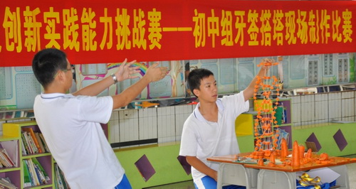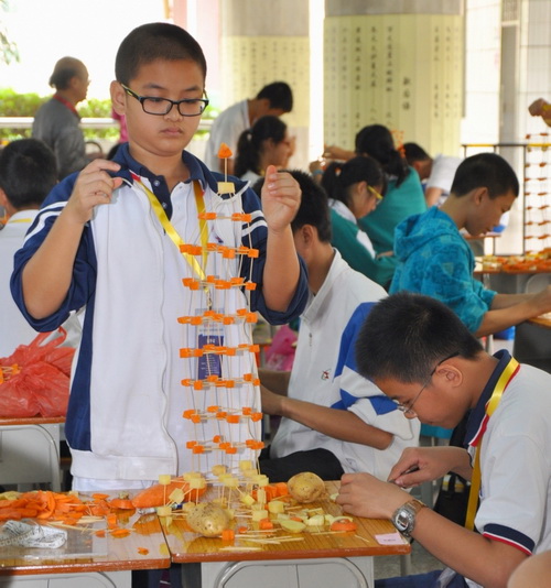 本届赛事面向全省在校中小学生,具有三大特点。一是学生封闭现场制作,同场PK,即时公布成绩,体现赛事的公平公正;二是制作材料来源简单,低成本,牙签搭塔用的是牙签、土豆和萝卜;三是具有较强的趣味性和科学性,考究学生的动手能力和物理知识,牙签搭出来的塔千姿百态,检验学生的动手能力和艺术创作水平。