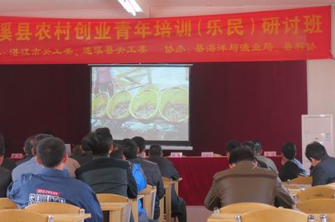 2013年12月31日上午,湛江市、遂溪县关工委联合遂溪县海洋与渔业局、遂溪县科学技术协会在乐民镇举办农村青年创业实用技术研讨班,为农村中青年创业者开展海水养殖技术培训。