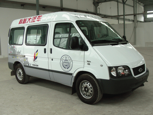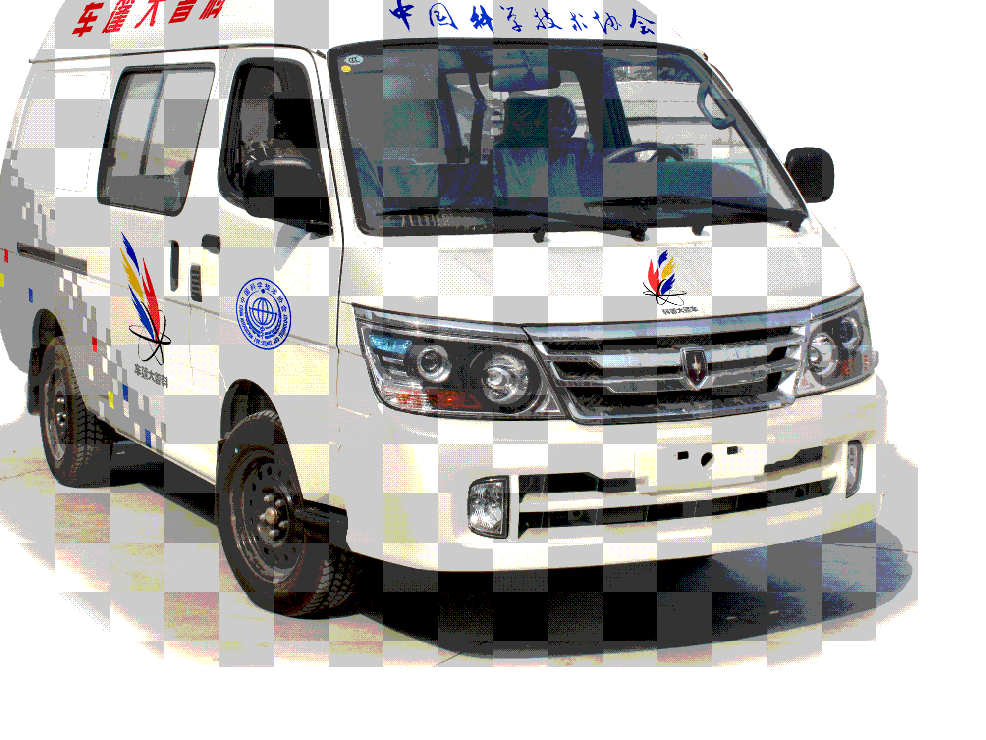 该车选用金杯牌快运轻型客车改装而成,国Ⅳ排放标准,采用汽油发动机,排量2.0升,车辆改装后长5020mm,宽1690mm,高2225mm,包括驾驶员共可乘坐5人。车内装备有科普宣传专用设备;配备多媒体广播系统,包括多媒体硬盘录放机、功放、音箱、各路信号间的切换装置等音响系统;投影机、投影幕等放映系统;设置220V市电电源接口及外接线缆盘等仪器设备,以适应基层宣教、试验工作的需要。