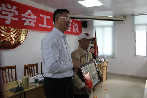 会上,原湛江市园林学会李善庆同志向市科协捐赠所收藏有关学会工作资料,肖斌主席向李善庆同志颁发了荣誉证书。