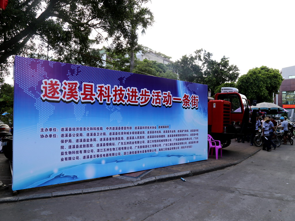 6月24日,遂溪县在县城人民路举办科技进步一条街活动。本次活动由遂溪县经济信息化和科技局、县委宣传部、县科协联合举办,湛江市科协、湛江中医学校和遂溪县经信、科技、科协、农业、卫生、食品监督、环境保护、气象、农机等20多个相关单位和企业到现场开展科技活动。活动主要以推广新技术、新成果,介绍优新品种、农业环境保护、无公害农产品、食品安全、标准化生产等知识为主要内容;以咨询服务、解难答疑、现场指导和发放技术资料为主要形式,共发放各种技术资料1万多份,接受咨询2000余人次,受到了广大群众的热烈欢迎。遂溪县委常委杨利荣、湛江市科协副主席郭向明、湛江市科协科普部部长黄承礼、遂溪县经科局局长陈波、遂溪县科协主席陈观荣等领导到场指导。