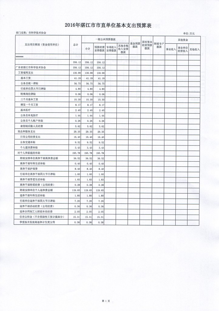 2016年湛江市科协部门基本支出预算表