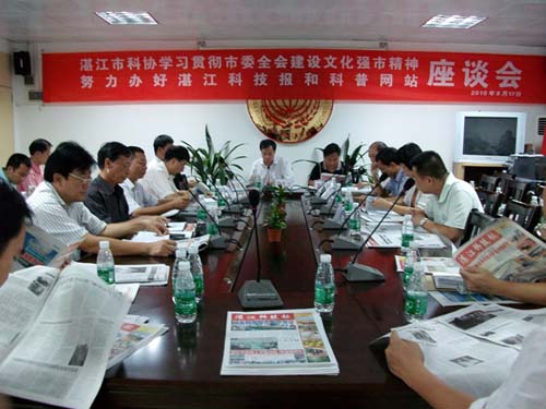 8月17日下午,湛江市科学技术协会举办了题为“湛江市科协学习贯彻市委全会建设文化强市精神,努力办好湛江科技报和科普网站”的座谈会。出席座谈会的有:市文化广电新闻出版局副局长周崇练及陈夏怡、房伟杰两位科长,市科协机关全体人员,市科技局办公室主任邱凌,湛江师范科研处唐荣波,广东海洋大学水生博物馆馆长杨文教授等,各县(市)区科协主席,湛江科技报社领导班子成员,市级学会(协会、研究会)秘书长等五十多人参加了会议。会议由科协副主席陈让主持。